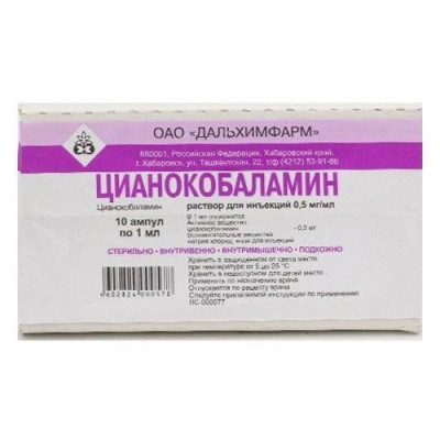 ЦИАНОКОБАЛАМИН 0,5МГ/МЛ. 1МЛ. №10 Р-Р Д/ИН. АМП. (ВИТАМИН В12) /ДАЛЬХИМФАРМ/