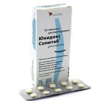 Внутрь. Обычно продолжительность лечения составляет 5-10 дней. Непосредственно перед применением таблетку следует растворить в небольшом количестве воды (не менее 50 мл) и тщательно перемешать до получения суспензии. Полученную суспензию необходимо принять сразу после приготовления. Предпочтительно принимать во время еды. Принимают полученную суспензию сидя или стоя, задолго до сна, что уменьшает вероятность развития эзофагита и язвы пищевода. Взрослым и детям старше 8 лет с массой тела более 50 кг назначают 200 мг в 1-2 приема в первый день лечения, далее по 100 мг ежедневно. В случаях тяжелых инфекций препарат Юнидокс Солютаб® назначают в дозе 200 мг ежедневно в течение всего лечения. Детям 8-12 лет с массой тела менее 50 кг средняя суточная доза - 4 мг/кг в первый день, далее - по 2 мг/кг в день (в 1-2 приема). В случаях тяжелых инфекций препарат Юнидокс Солютаб® назначают в дозе 4 мг/кг ежедневно в течение всего лечения. Особенности дозирования при некоторых заболеваниях: При инфекции, вызванной S.pyogenes препарат Юнидокс Солютаб® принимают не менее 10 суток. При неосложненной гонорее (за исключением аноректальных инфекций у мужчин): Взрослым назначают по 100 мг два раза в сутки до полного излечения (в среднем в течение 7 дней), либо в течение одного дня назначают 600 мг - по 300 мг в 2 приема (второй прием через 1 ч после первого). При первичном сифилисе назначают по 100 мг два раза в день в течение 14 дней, при вторичном сифилисе - по 100 мг два раза в день в течение 28 дней. При неосложненных урогенитальных инфекциях, вызванных Chlamydia trachomatis, цервиците, негонококковом уретрите, вызванным Ureaplasma urealiticum, назначают по 100 мг 2 раза в сутки в течение 7 дней. При угревой сыпи назначают по 100 мг/сут, курс лечения 6-12 недель. Малярия (профилактика): по 100 мг 1 раз в сутки за 1-2 дня до поездки, затем ежедневно во время поездки и в течение 4 недель после возвращения; детям старше 8 лет по 2 мг/кг 1 раз в сутки. Диарея "путешественников" (профилактика) - 200 мг в первый день поездки в 1 или 2 приема, далее по 100 мг 1 раз в сутки в течение всего пребывания в регионе (не более 3 нед.). Лечение лептоспироза - по 100 мг внутрь 2 раза в сутки в течение 7 дней; профилактика лептоспироза - по 200 мг 1 раз в неделю в течение пребывания в неблагополучном районе и по 200 мг в конце поездки. С целью профилактики инфекций при медицинском аборте назначают 100 мг за 1 час до и 200 мг после вмешательства. Максимальные суточные дозы для взрослых - до 300 мг/сут или до 600 мг/сут в течение 5 дней при тяжелых гонококковых инфекциях. Для детей старше 8 лет с массой тела более 50 кг - до 200 мг, для детей 8-12 лет с массой тела менее 50 кг - 4 мг/кг ежедневно в течение всего лечения. При наличии почечной (клириенс креатинина менее 60 мл/мин) и/или печеночной недостаточности требуется снижение суточной дозы доксициклина, поскольку при этом происходит постепенное накопление его в организме (риск гепатотоксического действия).
